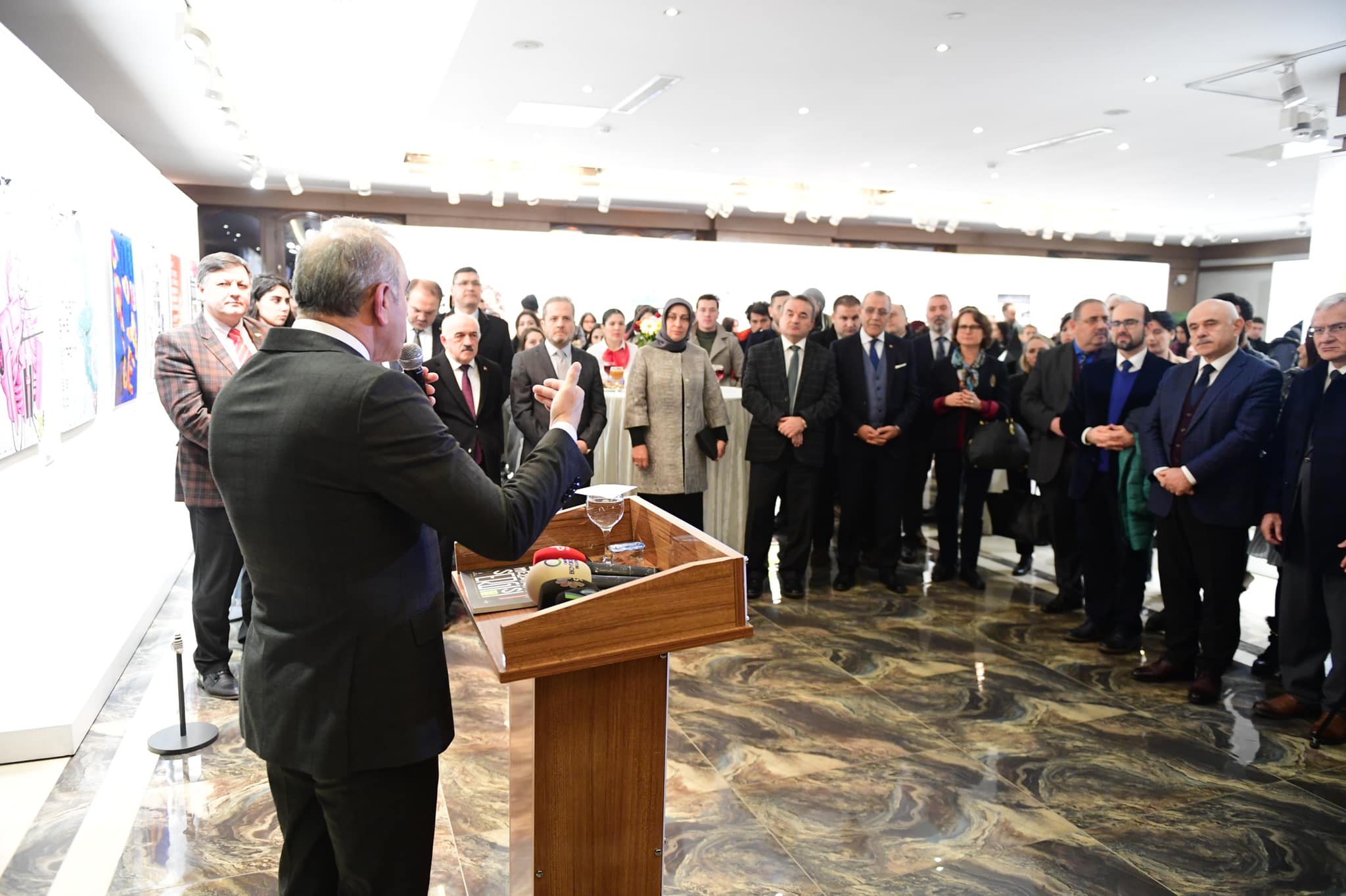 Serginin açılışında bir konuşma yapan Büyükşehir Belediye Başkanı Engin Tekintaş, şehirlerin tanıtılması için bu tür organizasyonların son derece önemli olduğuna dikkat çekerek, “Ev sahibi konumundaki Altınordu ilçemizde bulunan bu Sanat Galerimiz 24 saat açık ve yıl boyunca gezilebilir durumda. Bu mekânın yanı sıra Fatsa ve Ünye’de hazırladığımız salonlarımızda burada gördüğünüz eserleri ziyaretçilere sunarak diğer ilçelerimizin de yapılan çalışmalardan istifade etmesini sağlıyoruz. Bu güzel sergi salonlarını hizmete sunarken böyle güzel çalışmaların ortaya çıktığını milletimizin görmesini amaçlamıştık. Bu anlamda 9.su gerçekleşen bu sergiyi de burada açmamız ayrıca güzel ve önemli bir çalışma oldu. Şehirlerin kendini tanıtması için bu tür etkinlikleri sonuna kadar sürdürmesi lazım. Valiliğimiz ve diğer birimlerimizle iş birliği içerisinde bu tarz etkinliklerin daha da anlam kazanacağına inanıyorum. Emeği geçenlere teşekkür ediyor, sergimizin hayırlı olmasını temenni ediyorum” dedi.