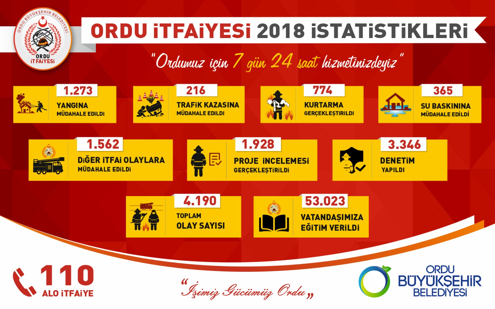 Güncel teknolojik gelişmeleri yakından takip ederek ihtiyaç duyulduğunda ülkenin her noktasında yardıma hazır olan Ordu Büyükşehir Belediyesi İtfaiye Teşkilatı, 2018 yılında da il genelinde 1273’ü yangın, 216’sı trafik kazası, 774’ü kurtarma, 365’i su baskını ve 1.562’si diğer olaylar olmak üzere toplam 4 bin 190 olaya müdahale etti.